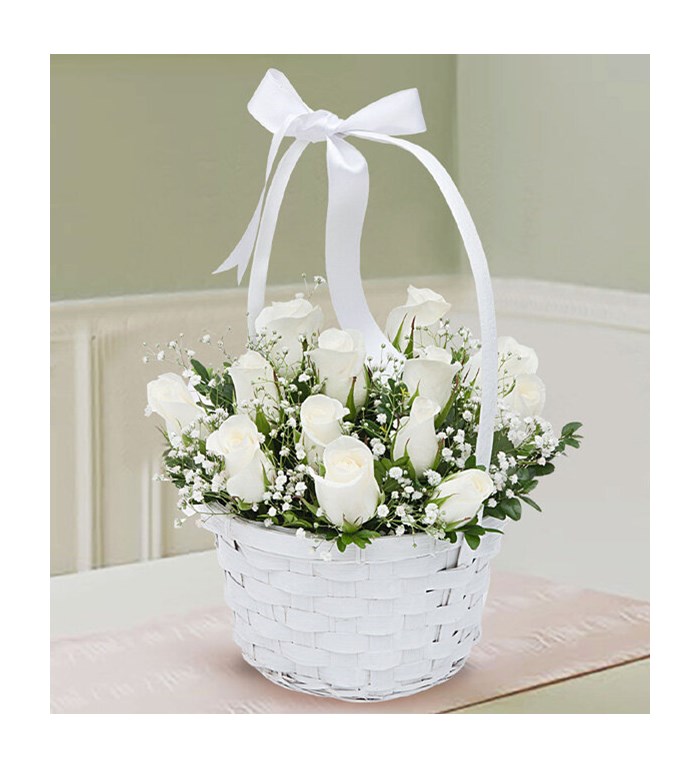 Sade ve şık sunumuyla Beyaz Gül Sepeti, taze beyaz güllerden oluşur. Çiçeğin yaklaşık yüksekliği 25 - 30 cm boyutlarındadır.