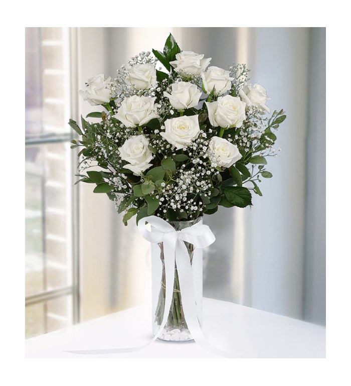 vazo içerisinde 11 li beyaz gül yeşillikler ve cipso ile süslenmiş.